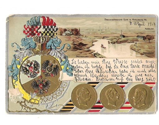 Myslowitz , coins of three emperors and decorated coat of arms , with text
