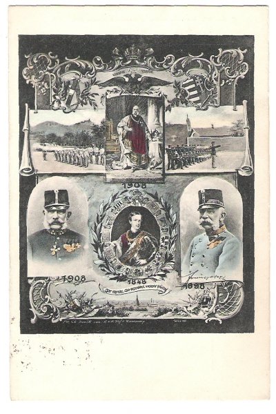 Portraits of Franz Joseph , view to Vienna and practising soldiers , in 1908