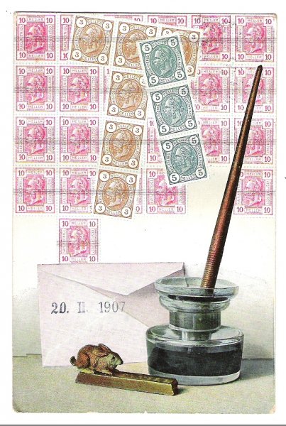 Printed stamps , ink-bottle with a pen and sealing-wax