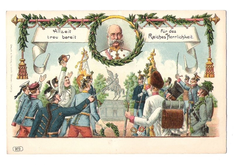 Color portrait of Franz Joseph , signs and emblems of national