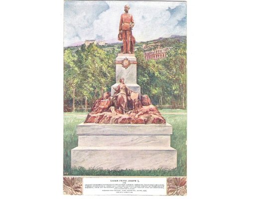 Statues of Franz Joseph I., a woman, and a lion, colored