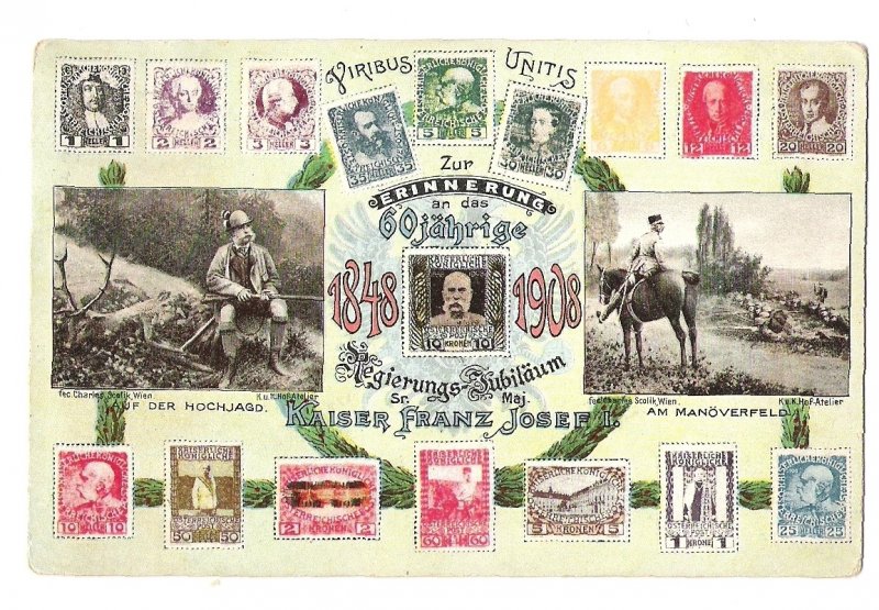 F.J. sedící v mysliveckém a na koni + natištěné známky, 2.tisk