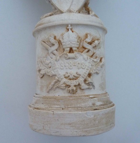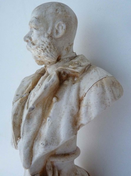 František Josef - busta / starý odlitek z jakési hmoty , v museu je tato busta z kovu na dřevěném černěném podstavci - podklad pro kovový odlitek ???