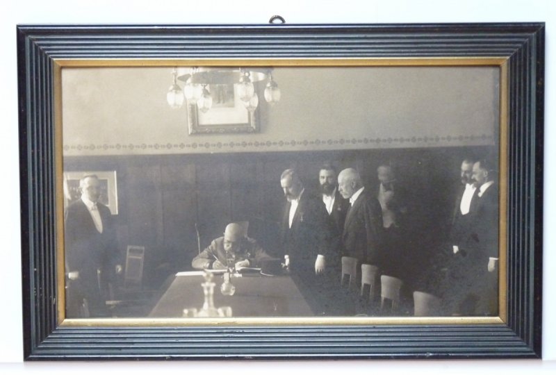 František Josef při podpisu smlouvy - tato originální fotografie byla použita jako předloha k známé pohlednici ( pouze jen část obrazu s F.J.I. ) - mimořádné