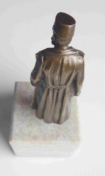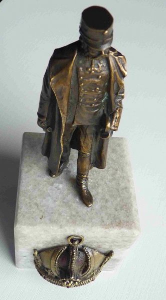 Mosazná socha císaře v polní uniformě na mramorovém podstavci s císařskou korunou