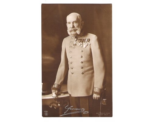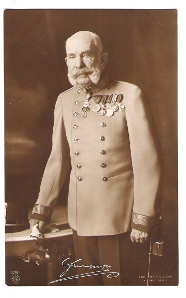 Franz Josef v uniformě, opírající se o pracovní stůl