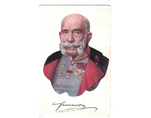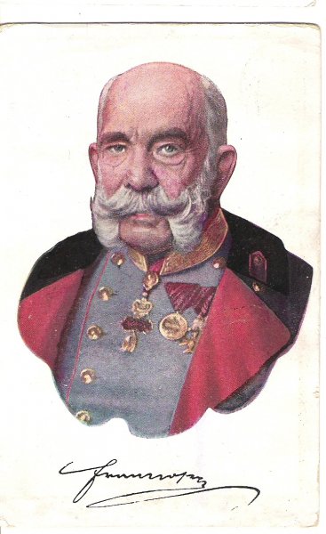 Franz Joseph s modrou blůzou a černočerveným kabátem