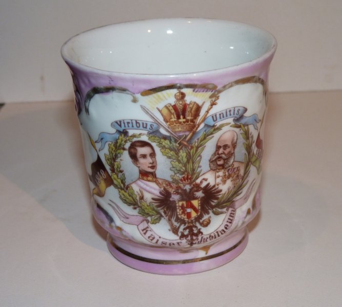 Franz Joseph ve služební uniformě, rostlinný motiv a vlajka