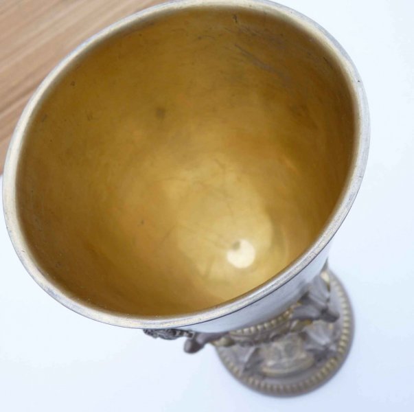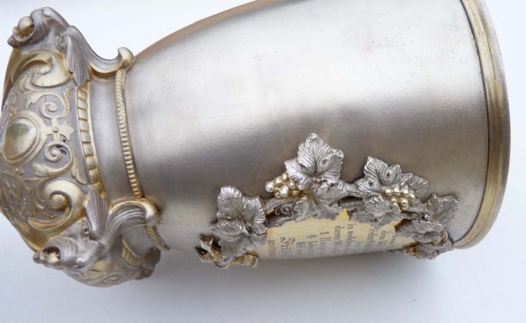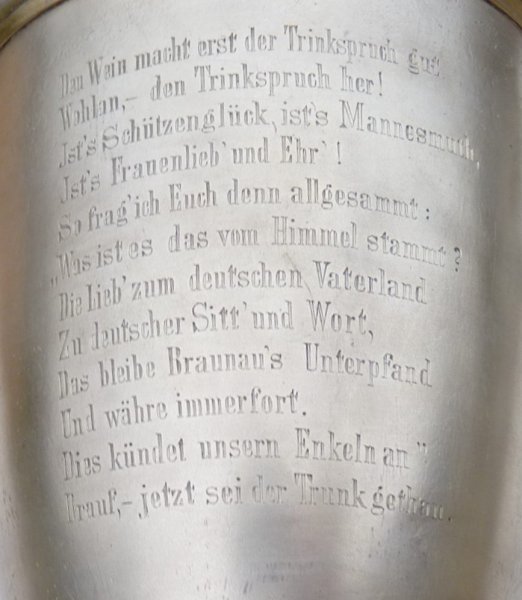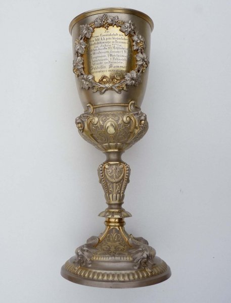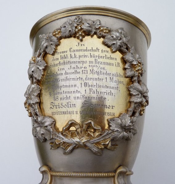 Zlacený stříbrný pohár - darovaný z úcty od střeleckého krále a vojenského kapelníka - Fridolín Sommer - členům střeleckého klubu K.K. Braunau v Čechách - Broumov rok 1885-86 ( na poháru je soupis členů .... ) pohár je 27 cm vysoký a váha 0,5 kg