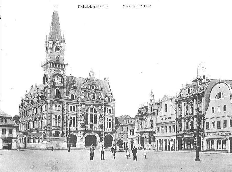 "Za vlády Jeho Majestátu císaře Franze Josefa I. vybudovalo německé město Frýdlant tuto radnici v letech 1892-1896, v době správy starosty Johanna Krause, podle plánů c.k. stavebního rady Franze rytíře Neumanna z Vídně prostřednictvím zdejšího stavebního mistra Wilhelma Stárze. Frýdlantská spořitelna pod vedením ředitele Heinricha Ehrlicha umožnila tuto stavbu svými příspěvky."