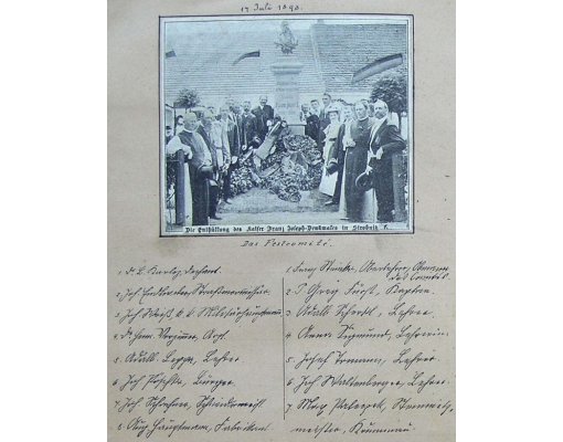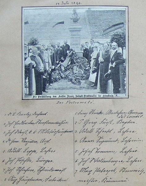 Slavnostní "komité" při odhalení památníku císaře Františka Josefa v Horní Stropnici na snímku, kde je zachycen prvý zleva (pátý zleva stojí Adalbert Leppa, otec spisovatelů Karla Franze a Konrada Leppových, šestý zprava Hans (Johann) Waltenberger a prvý zprava Franz Steinko, ředitel školy a předseda celého výboru)