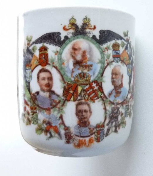 Čtyř portrét na porcelánovém hrníčku - František Josef , Karel a dva generálové/ Hotzendorf a Friedrich ( v museu je tento již druhý )