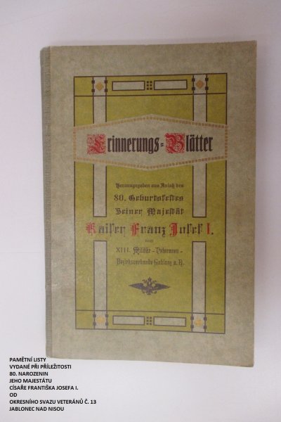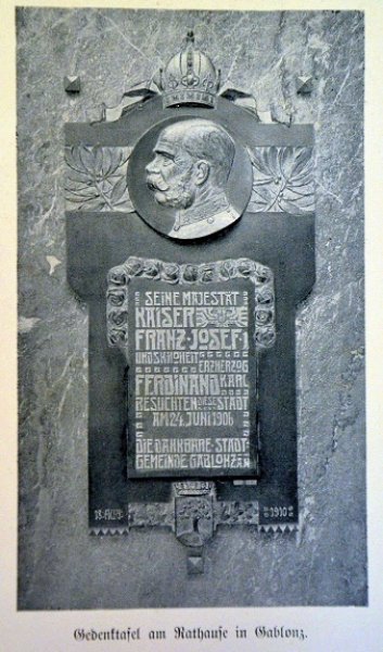 Fotka pamětní desky pochází ze souboru pamětních listů, které vydal Okresní svaz vojenských vysloužilců č. 13 v Jablonci nad Nisou při příležitosti 80. narozenin císaře FJI. v roce 1901.