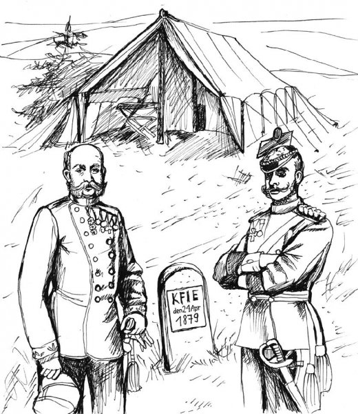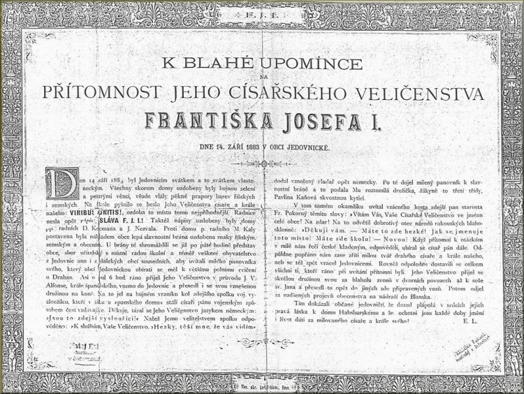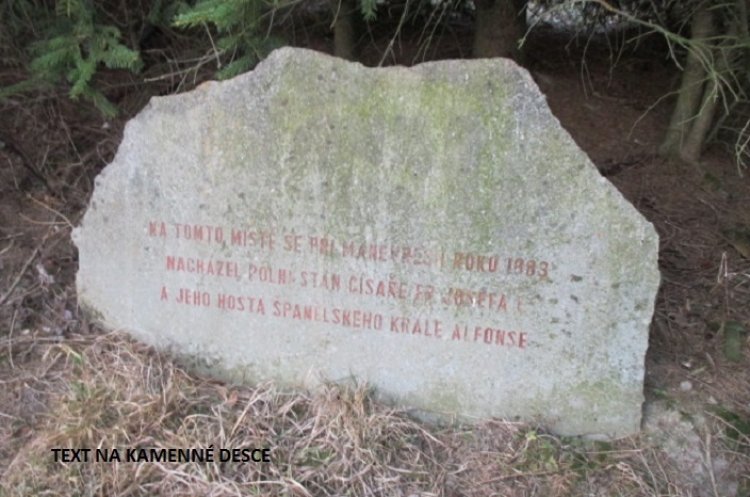 Kresba Mgr. Jitky Vávrové na titulní straně Jedovnického zpravodaje květen/červen 2016 zachycuje císaře FJI a španělského krále Alfonse XII před polním stanem v pozadí a pamětním kamenem, který je dnes umístěný v rohu smrkové ohrady na břehu potoka u Vrbového rybníka poblíž hráze. Kámen je vysoký asi 75 cm nad terénem, široký 25 cm a tlustý 11-13 cm. Podle D. Varnera je z kulmské droby či prachovce. Na čelní straně jsou v rámečku litery KFIE a pod nimi rok 1879. Mezi oběma řádky je i nezřetelný další text „den24Apr". Je tedy datován na 24. duben 1879. KFIE vyjadřuje KAISER FRANZ IOSEPH ERSTE, tedy Císař František Josef První. Pro den 24. dubna 1879 našel vysvětlení PhDr. Jiří Doležel – ten den slavili František Josef I. a císařovna Sisi stříbrnou svatbu, slavnosti probíhaly po celé monarchii. Takže tuto událost připomíná kámen u Vrbového rybníka!