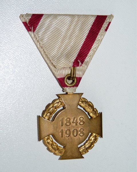 Jubilejní kříž z roku 1908 na vojenské stuze , zlacená bronz