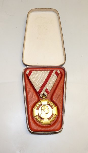 Jubilejní kříž z roku 1908 na vojenské stuze , zlacená bronz - originální etue
