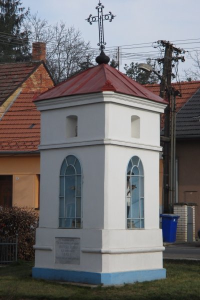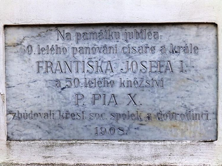 „Na památku jubilea 60letého panování císaře a krále Františka Josefa I. a 50letého kněžství papeže Pia IX. Zbudoval křesť. soc. spolek a dobrodinci 1908."
