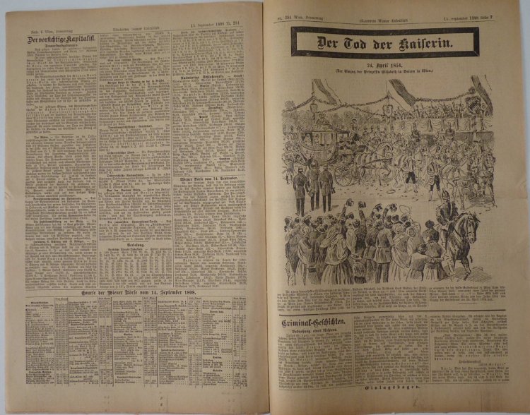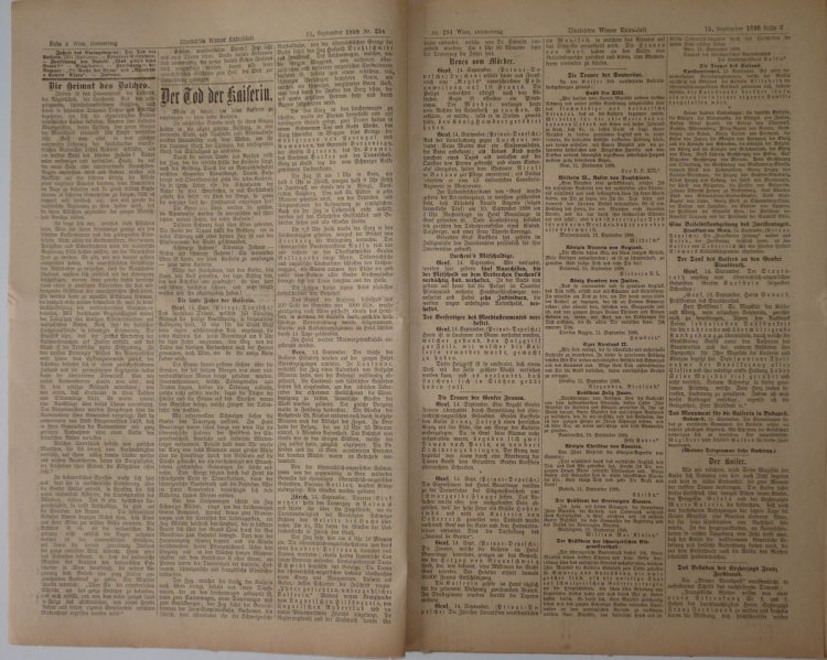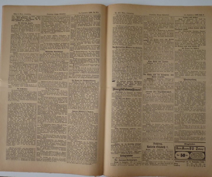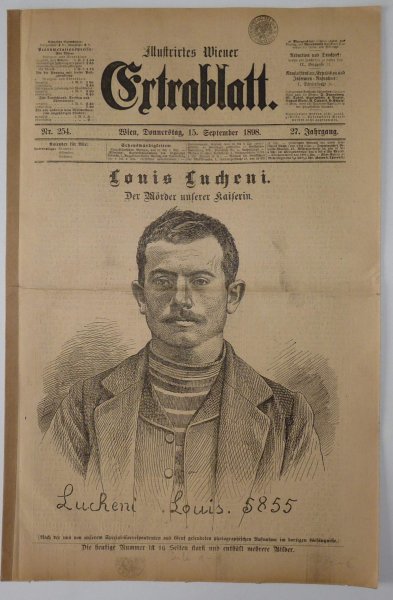Kompletní noviny popisující atentát na císařovnu Sissi - vrah Lonis Lucheni