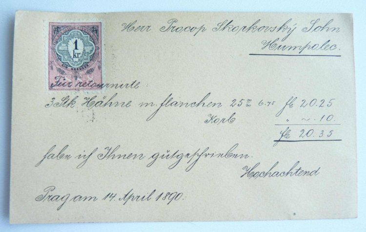 Korespondenční lístek - fungující jako daňový doklad od prodávajícího - stvrzeno kolkem / znehodnocený přepisem