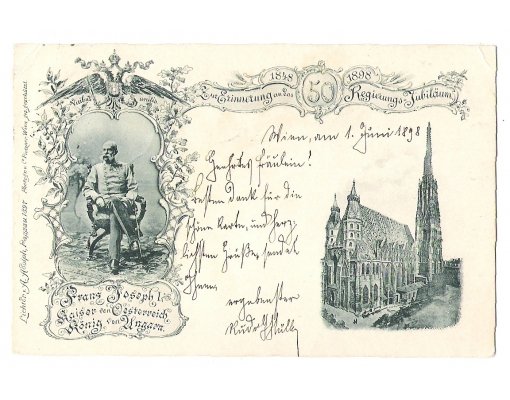 Kostel a sedící císař Franz Joseph na pohlednici