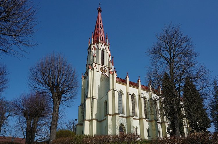 V letech 1866–1868 byla původní stavba kromě věže zbourána a nahradil ji dnešní pseudogotický trojlodní kostel. V oknech kostela jsou novoborské vitráže zobrazující zastavení křížové cesty a jména mecenášů poslední přestavby kostela. Jeden z dárců byl i císař František Josef I. Jeho portrétu bylo vyhrazeno čestné místo přímo za oltářem.