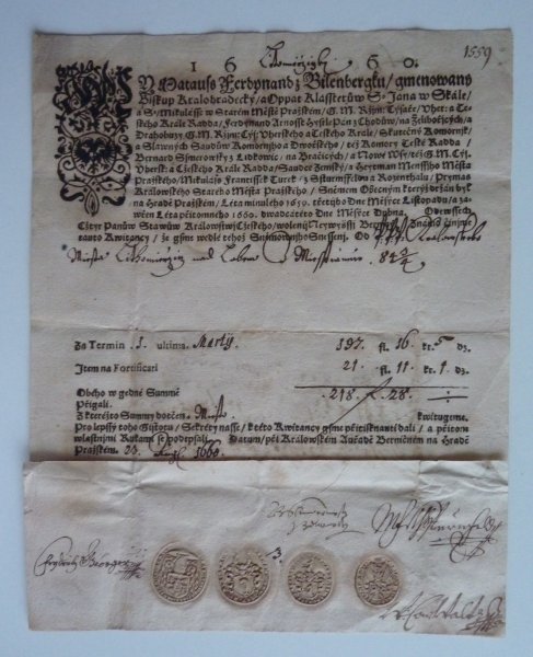 Listina - kupní smlouva - Ferdinand z Balinbergu a další šlechticové , podpisy a pečetě, zřejmě opět odesláno jako dopis