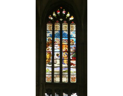 Prostřední malované okno nad hlavním oltářem chrámu sv. Barbory připomíná oslavy 70. narozenin císaře FJI. Jeho donátor, rada vrchního zemského soudu JUDr.Schneider-Svoboda, v dopise předsedovi archeologického spolku Vocel vyslovil přání, aby bylo toto okno opatřeno následujícím věnovacím nápisem: