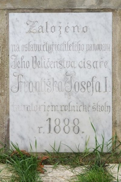 V roce 1888, u příležitosti oslav 40. výročí panování císaře FJI, zřídilo vedení kutnohorské rolnické školy panovníkovi pomník v parčíku před bočním vchodem do jezuitské koleje. Při stavbě pomníku použili původní ozdobné části vnějších pilířů, tzv. fiály. Základem pomníku byl nízký zděný sokl, na němž byl složen z dílů několika různých fiál samotný pomník. Na přední straně soklu byla umístěna pamětní deska s textem připomínajícím 40. výročí panování císaře. Tato deska byla po vzniku Československa odstraněna. Tím na první pohled zanikla vazba pomníku na císaře FJI a pomník stojí na svém původním místě dodnes. Potvrdil mi to pan Lukáš Provaz, kronikář města Kutná Hora.
