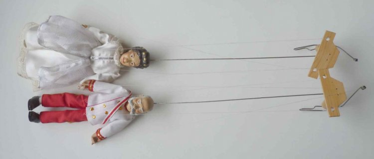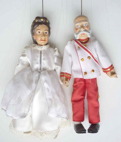 Dvě marionety - císař František Josef a císařovna Elisabeta . V museu je již jedna loutka císaře - tato je trochu odlišná . Výška cca 23 cm + ovládací mechanismus .