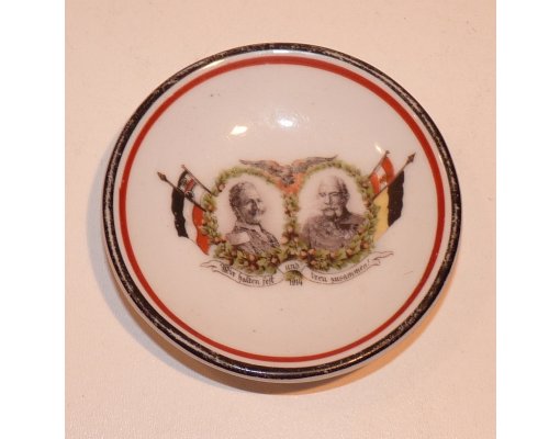 Malý talířek s portrétem Franz Josefa I. a Wilhelma II. se znaky a vlajkami