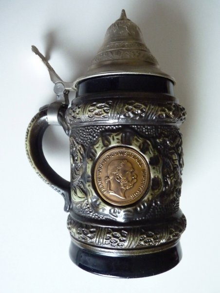 Novodobá replika starého půllitru s cínovým víkem a pozlacenými medailemi s portréty Marie Terezie a Františka Josefa I.