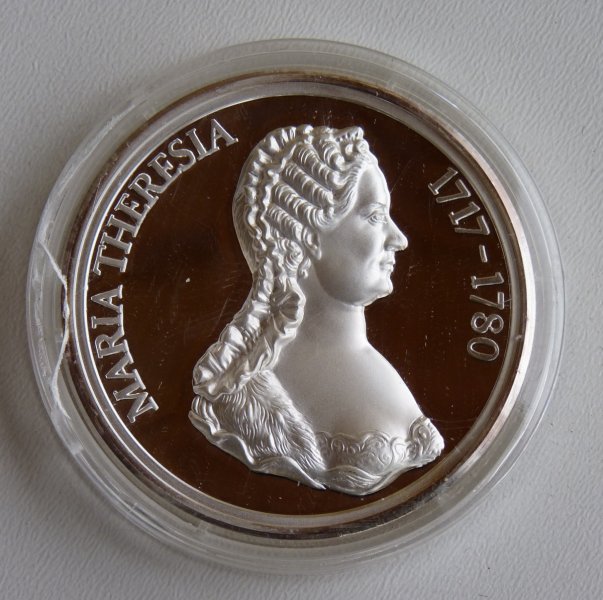Marie Terezie na medaili s rakouskou orlicí a erbem