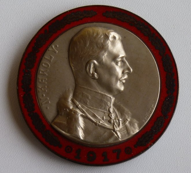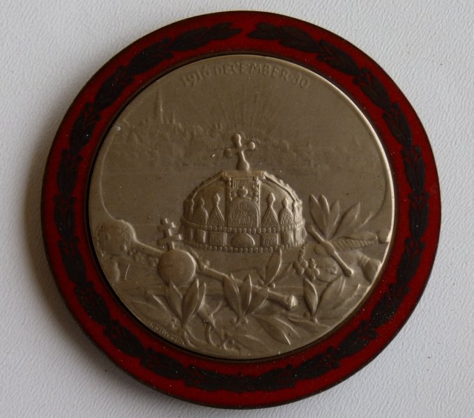 Medaile Carl Franz Josefa s červeným smaltem okolo , maďarské korunovační klenoty - koruna , žezlo a jablko