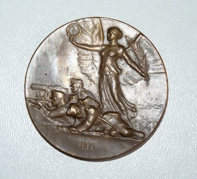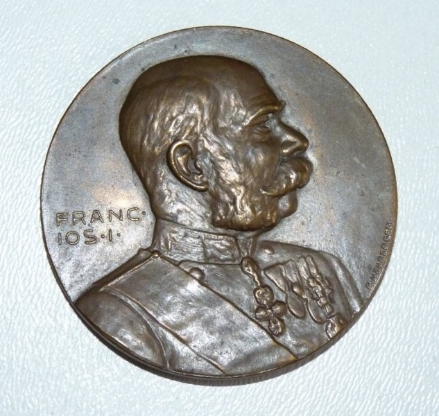 Bronzová medaile, na níž je císař František Josef a ležící vojáci, pozorující anděl ze shora