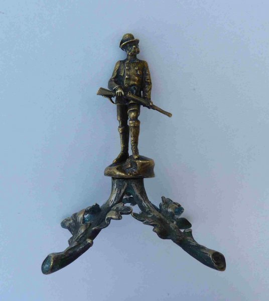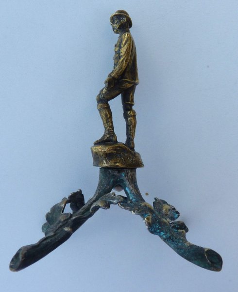 Miniaturní socha císaře Františka Josefa v mysliveckém - na podstavci / tato soška v museu již zastoupena je - ale bez podstavce . patinovaný zinek nebo mosaz