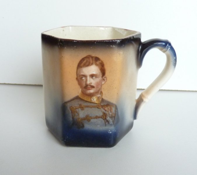 Mladý uniformovaný císař Karel na modrém hrnečku