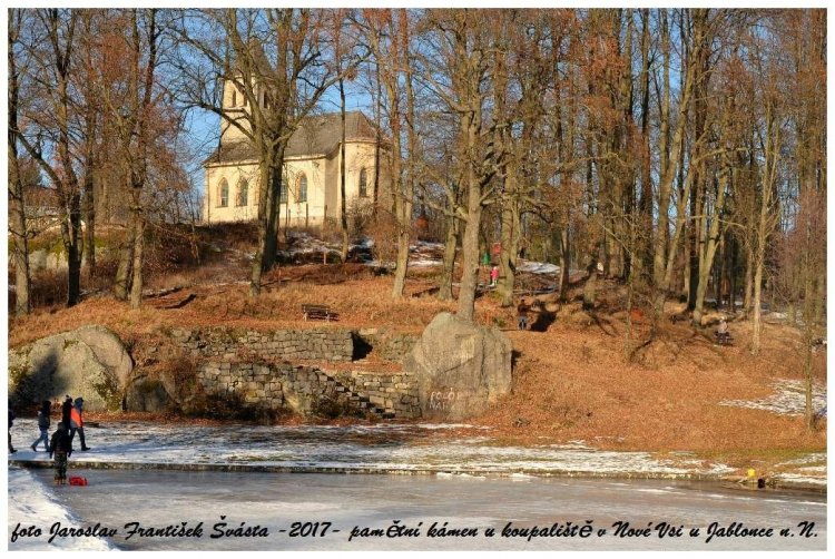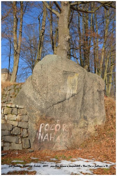 s Konrádem Königem starším (na snímku je to ten sedící zcela vpředu - nalevo od muže s bubínkem) byl při této příležitosti umístěn na skalisku, vystupujícím na severní straně velkého loďkového rybníku, pamětní nápis, připomínající tuto událost. V letech následujících se stejně jako celý areál Königova hotelu i toto místo dál vyvíjelo. Nápis na skále byl nahrazen záhy pamětní deskou, vedle skály vznikla kamenná terasa se schodištěm, na níž byl umístěn dřevěný zámeček. Pod terasou – na břehu rybníka – se nalézal prostor se sezením pro hotelové hosty ohraničený kamenným valem. Skalisko bylo tehdy nazýváno císařským kamenem (Keiserstein), v průběhu první republiky pak musela být pamětní deska jako symbol rakousko-uherské monarchie sňata.