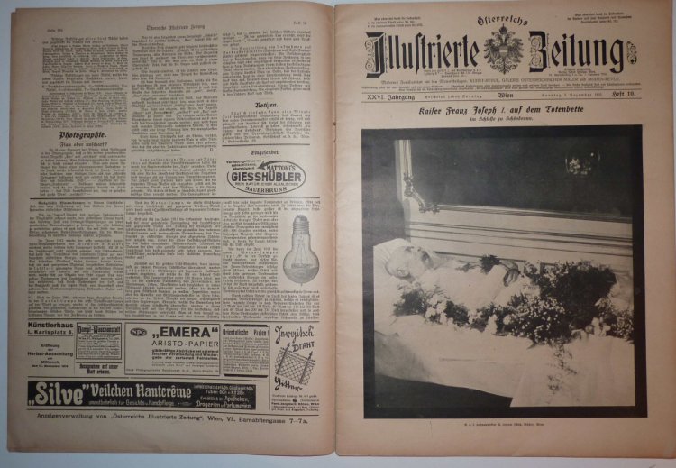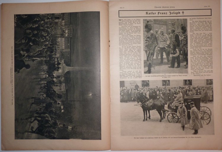 Noviny ,, ILLUSTRIERTE ZEITUNG ,, - kompletní noviny vydané k úmrtí Franz Josefa ... mnoho snímků a popisů etap jeho života / vlastní pohřeb
