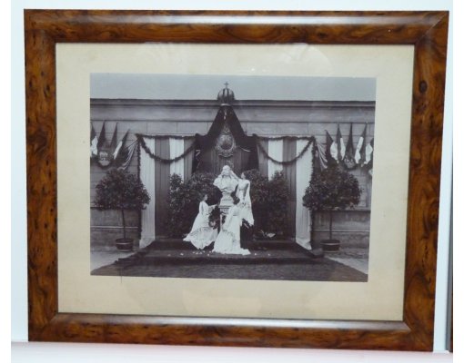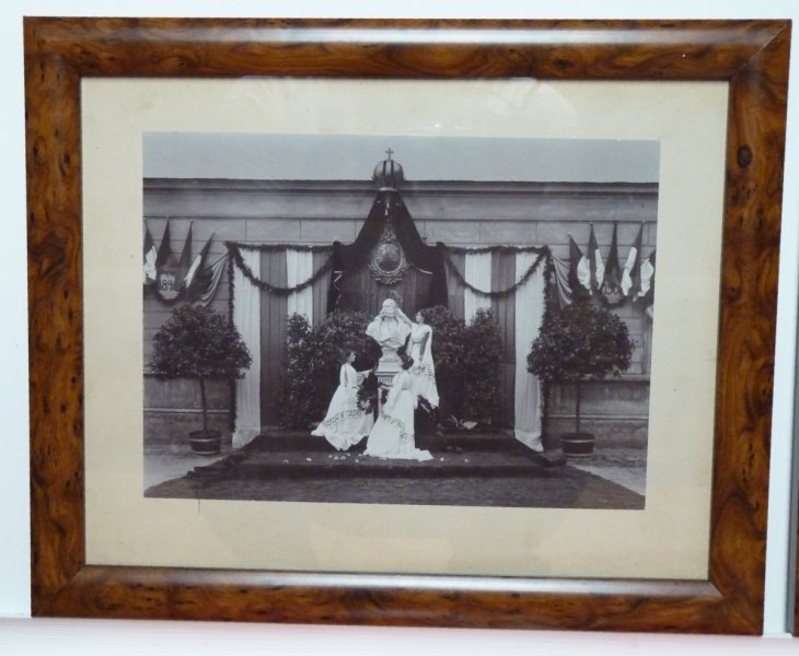 Památeční busta Františka Josefa a stojící ženy