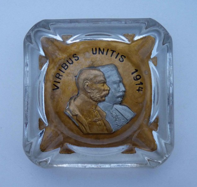 Patriotický popelník s portréty císařů Františka Josefa a Viléma