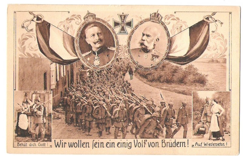 Pochod vojáků na frontu, císařové Franz Josef a Wilhelm