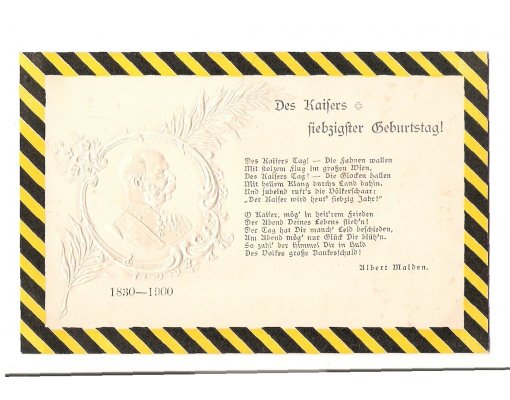 Pohlednice k císařovým 70. narozeninám s básní Alberta Maldena