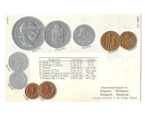 Pohlednice s mincemi Franz Josefa- maďarské vydání