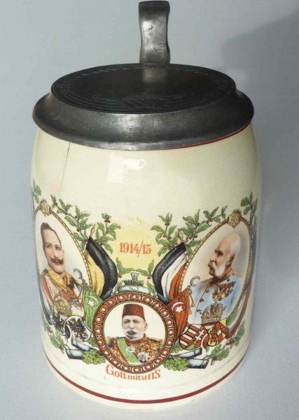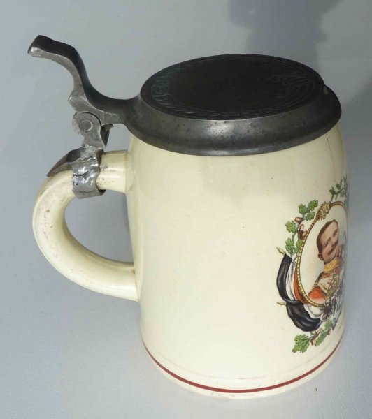 Půllitr s cínovým víkem.Portréty císařů FJI , WII a Mohameda V.