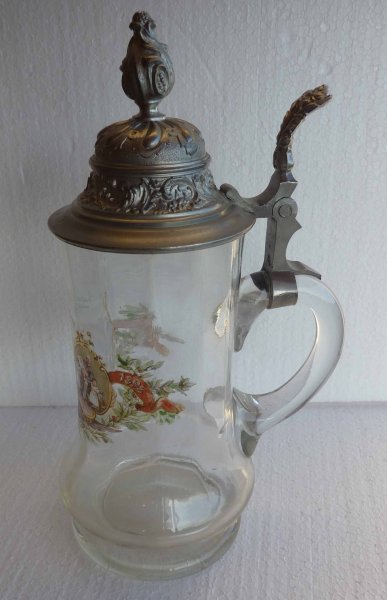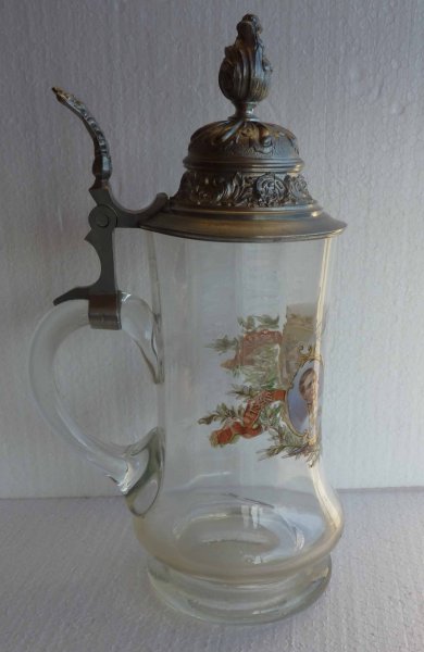 Skleněný půllitr s cínovým víkem - portréty mladého a starého Františka Josefa s dětmi budoucího císaře Karla