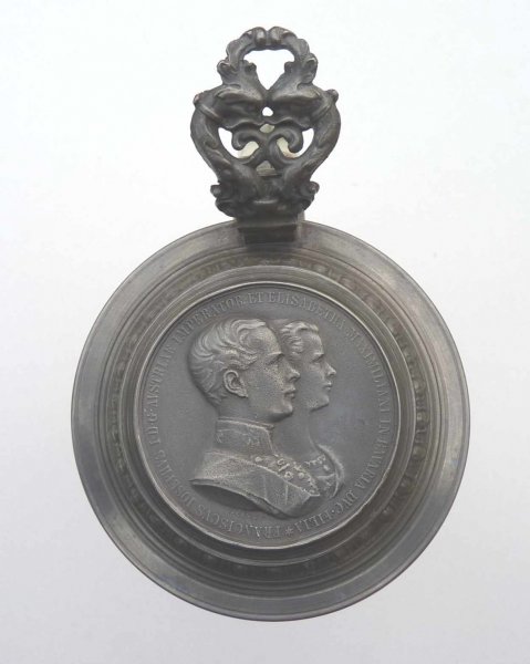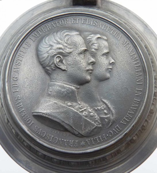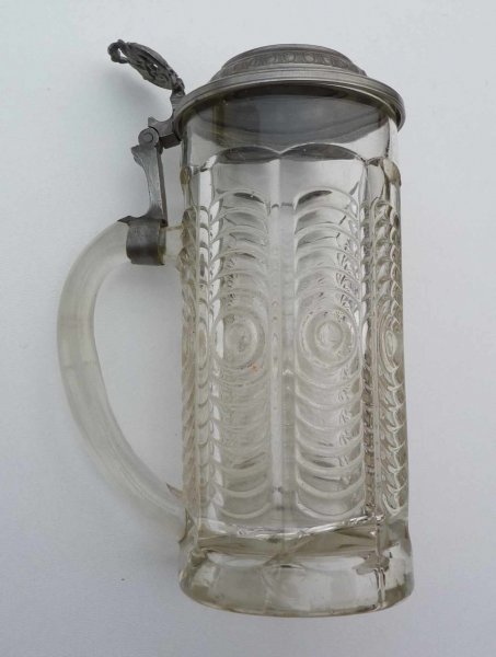 Skleněný půllitr s cínovým víkem na kterém je dvojportrét Elisabeth a Františka Josefa