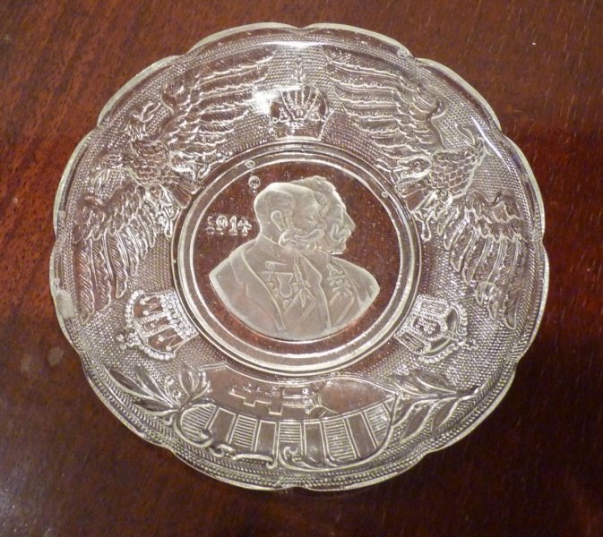 Skleněný talíř se znaky a portrétem Franz Josefa I.a Wilhelma II