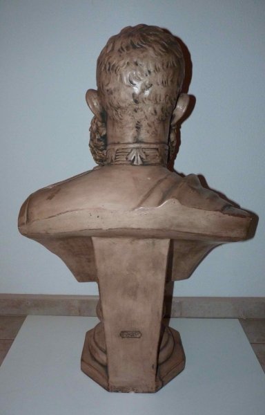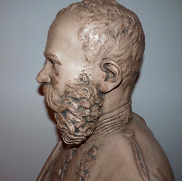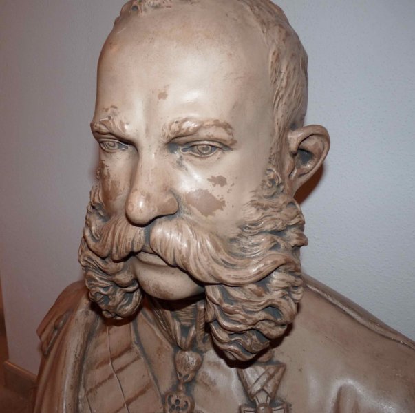 Bista (busta) - Franz Josef . Tato busta bývala umístěna u vyšších ůředníků správy monarchie Rakouska-Uherska . Na chodbách či méně důležitých místech bývaly sochy ze sádry - tato je z kvalitní cihlové hmoty (terakotty ) - mírně načervenalé směsi , vypálena a poté patinována . Poměrně malý výskyt .Za dobu své sběratelské činnosti jsem viděl pouze další dva exempláře . Výška 80 cm .