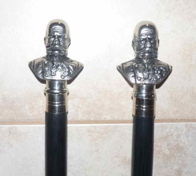 Dva kusy špacírek s rukojetí ve tvaru busty Franz Josefa - novodobá napodobenina staré hůlky