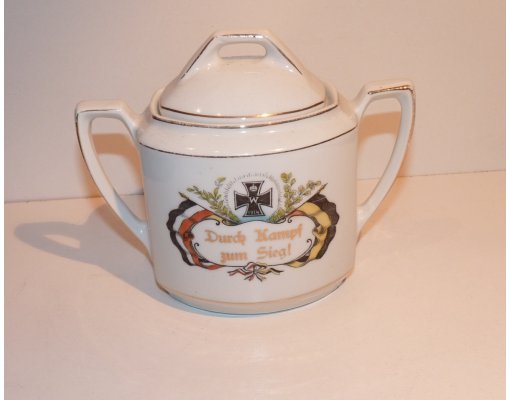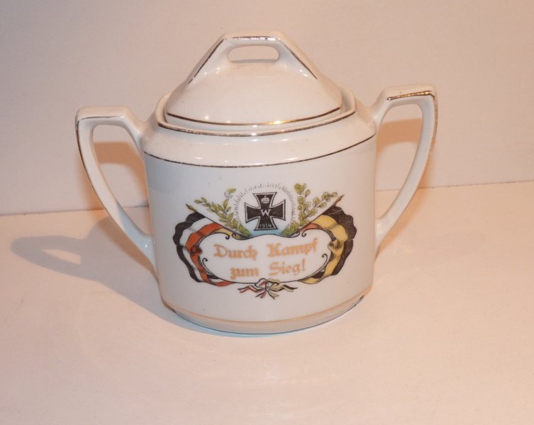 Státní vlajky, rostlinný motiv a Wilhelmův kříž na hrnečku